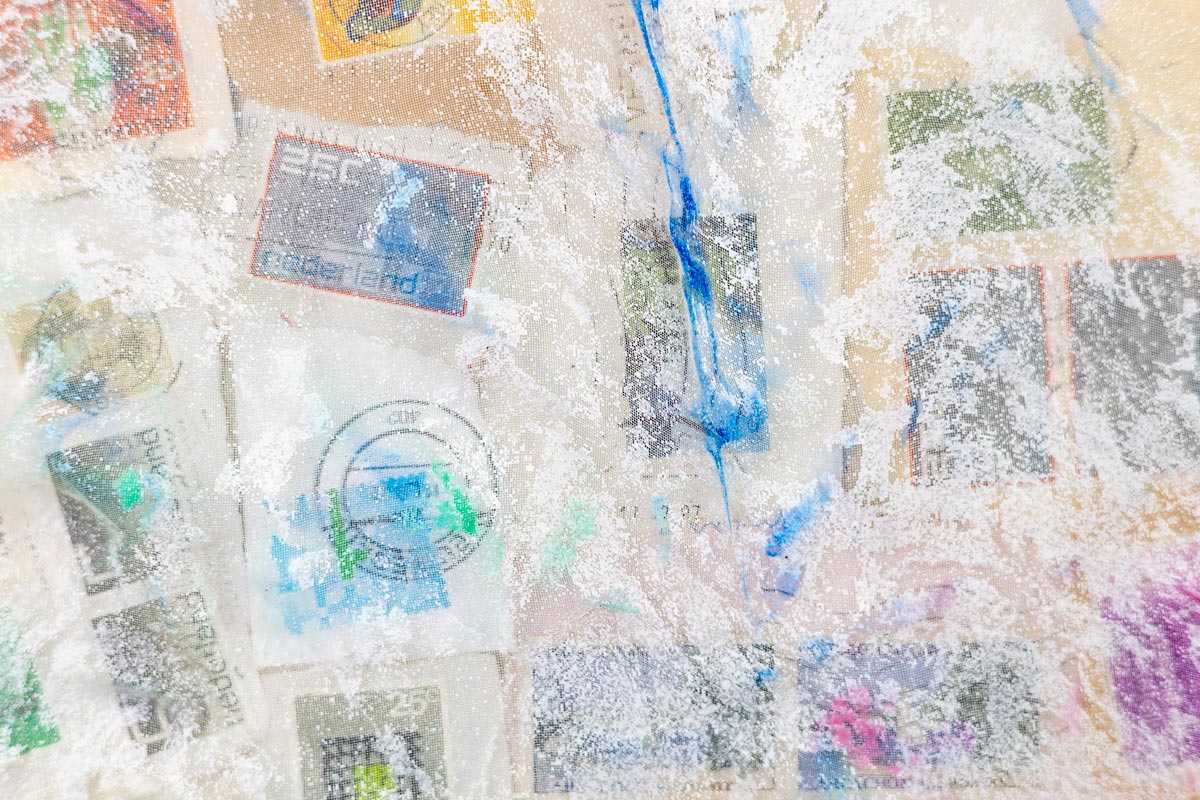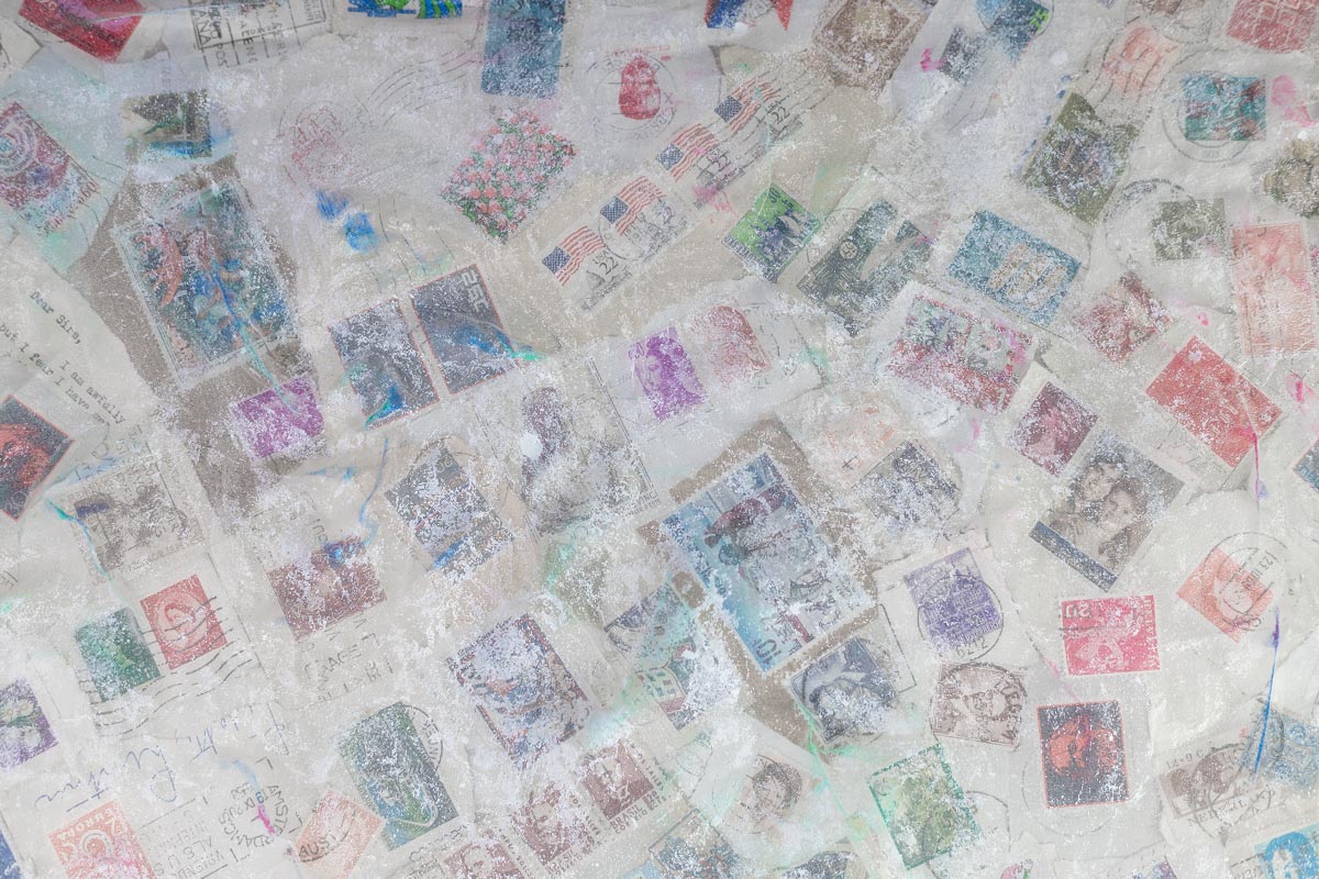 This mixed-media artwork is made from dozens of collected postage stamps, layered onto paper and covered with a thin organza fabric. Each fragment once travelled across the world carrying messages between people and places.