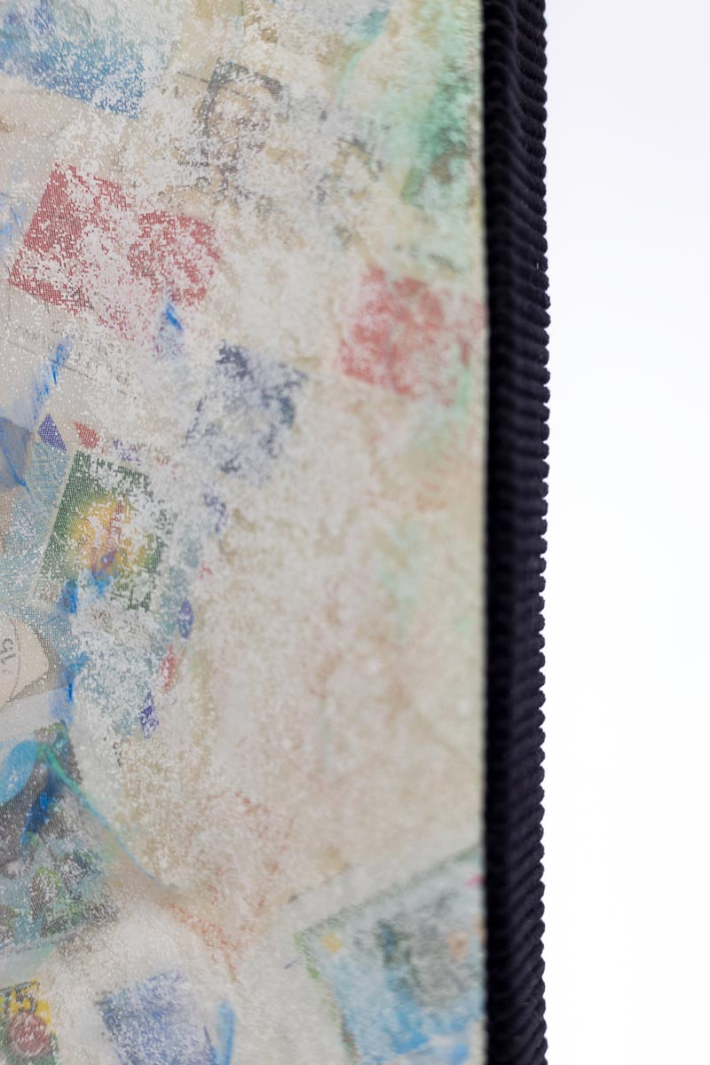 The organza fabric represents memory, like our own subjective recollection, it softens and blurs what lies beneath. Together the layers form a collective memory: traces of communication, travel and exchange embedded in a single surface.