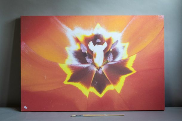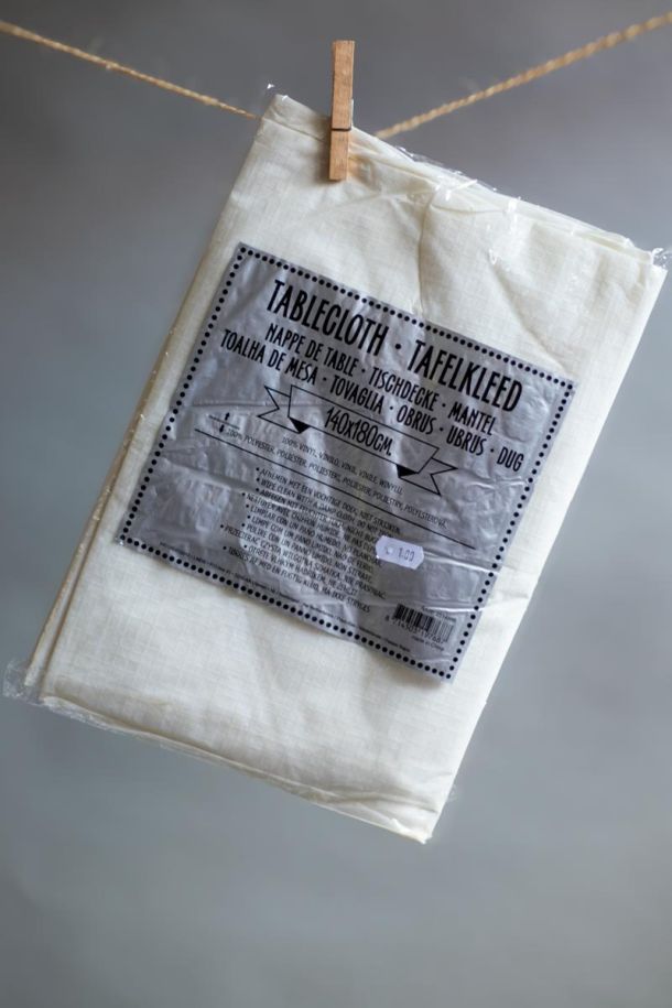 A painting frame, two pieces of fabric, a tablecloth, postage stamps on envelopes