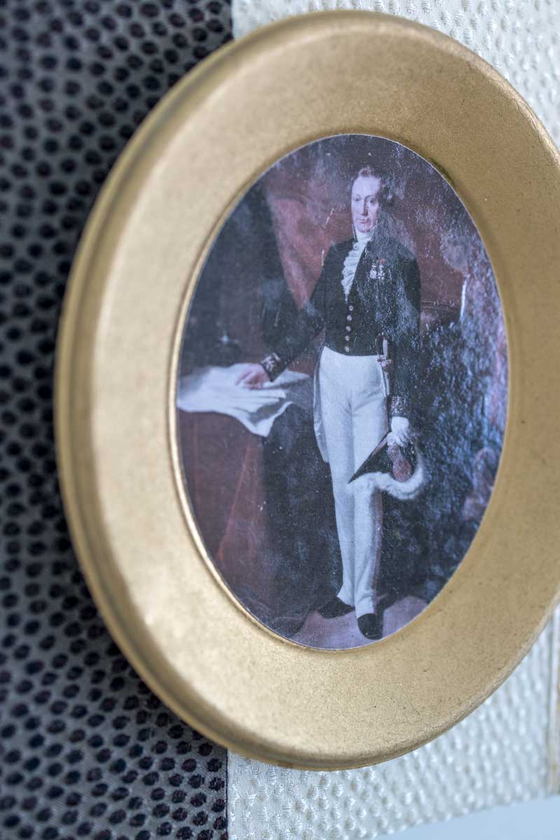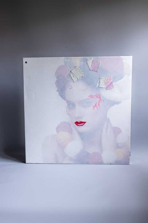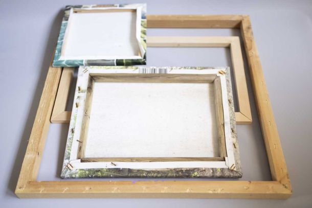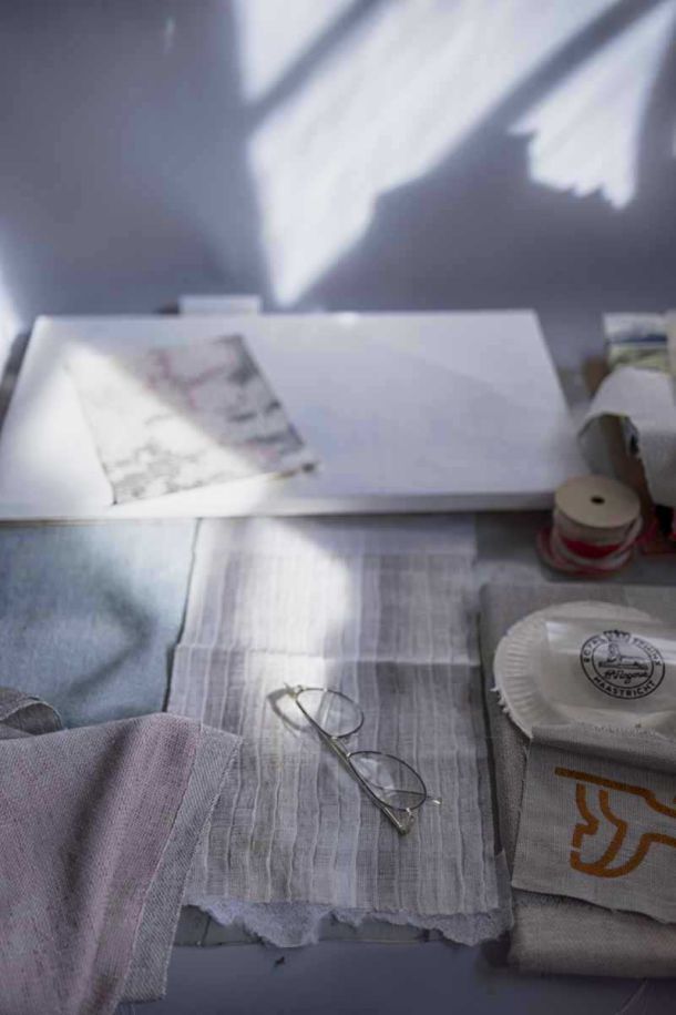 Pieces of curtain, old bedsheet, disposable plates, fabric samples from sample books, silk fragments from lampshade workshop, old picture frames from discarded paintings.