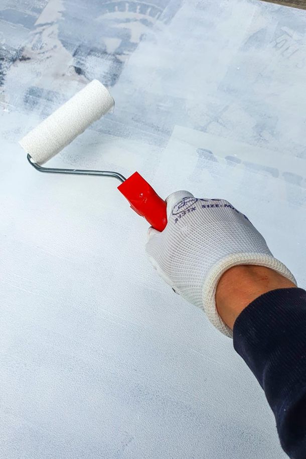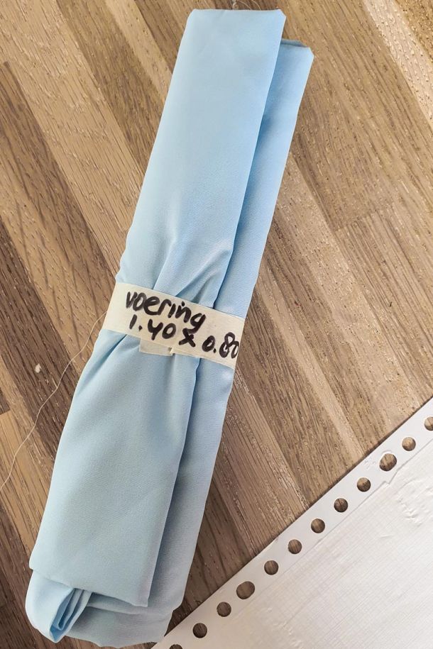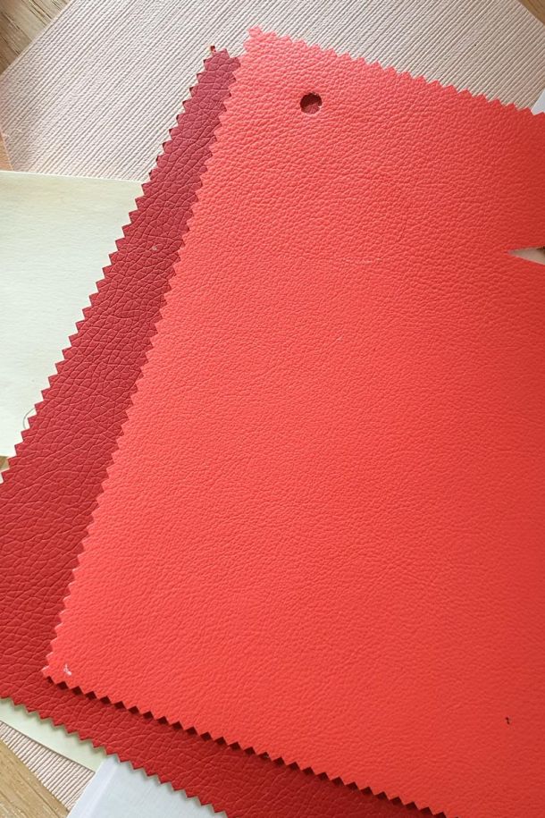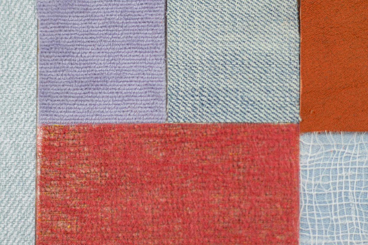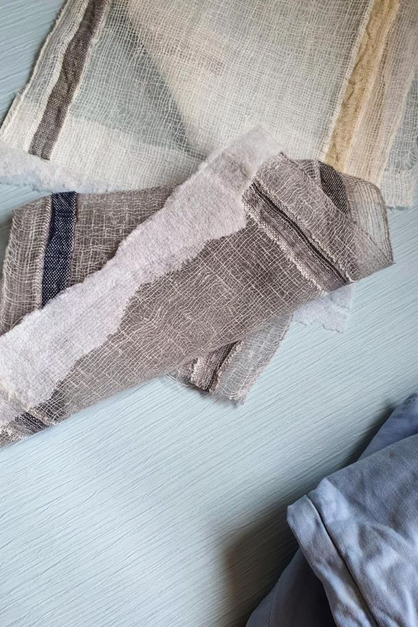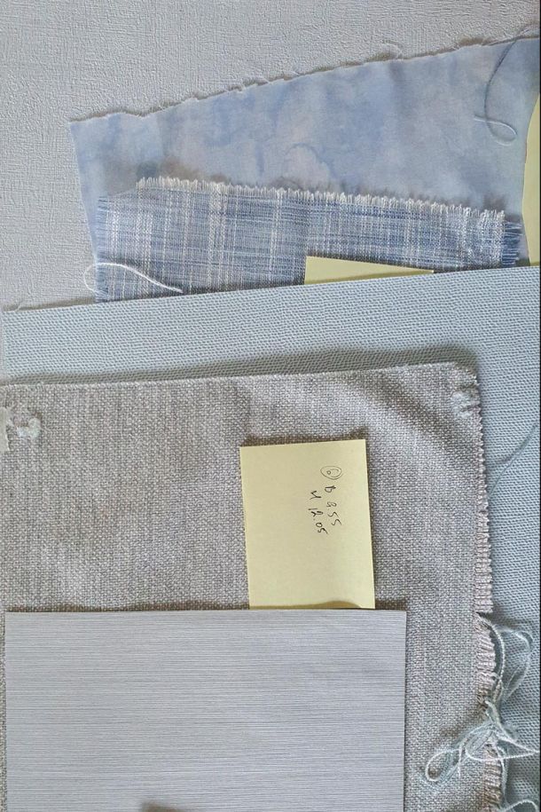 A picture frame, pieces of fabric from sample books, a piece of fabric, old wallpaper, wrapping paper.