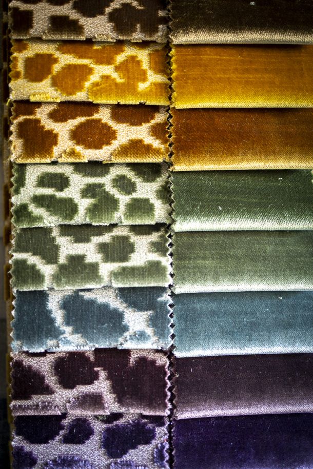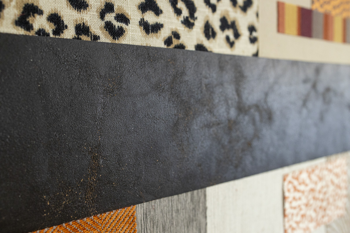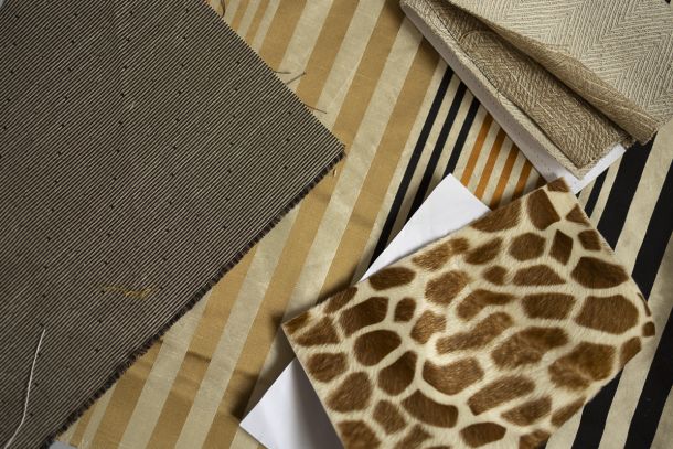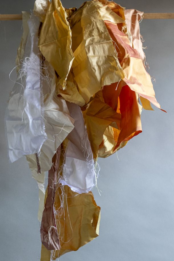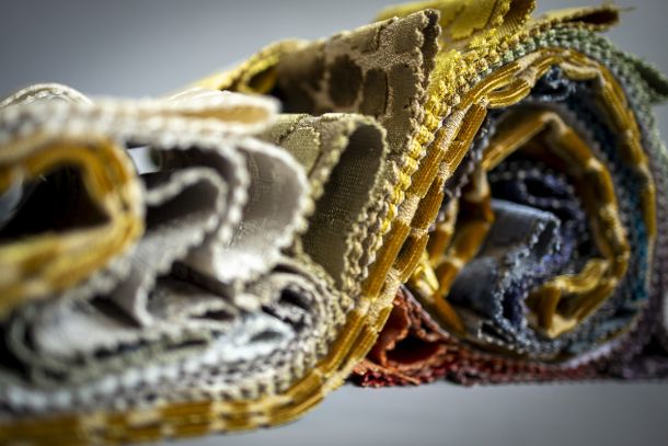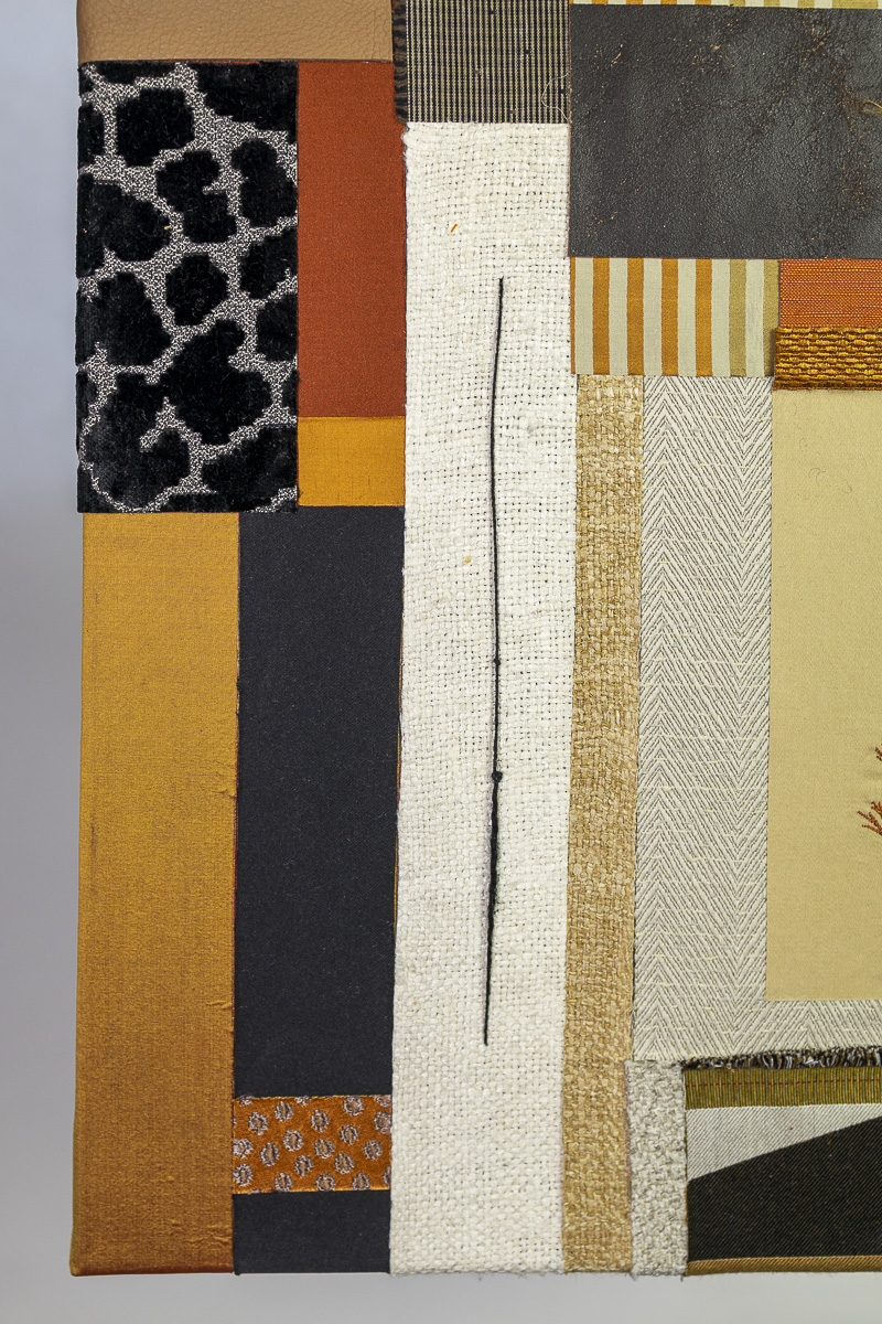 Painting frames, ladies’ shawls, leather scraps, lampshade cut-offs, fabric pieces, interior sample books, woollen yarns, horsehair canvas.