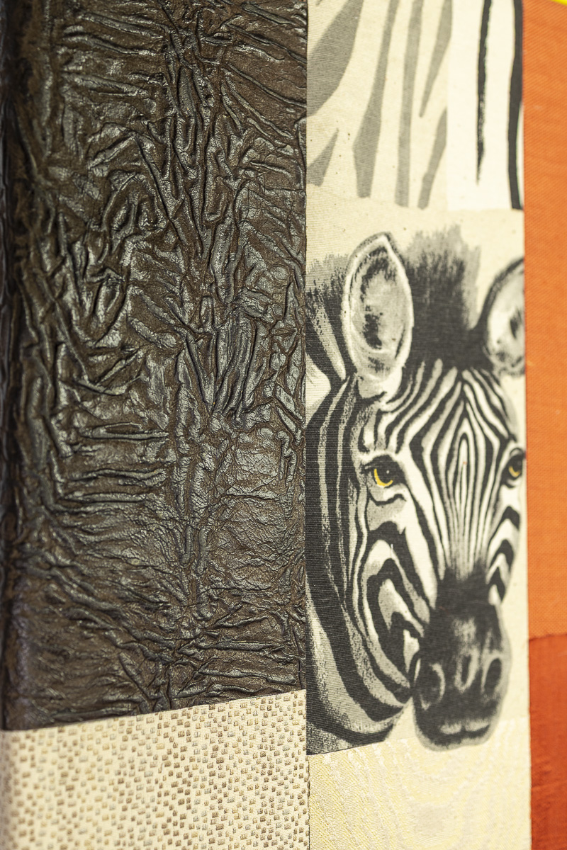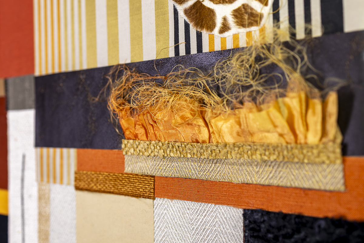 These upcycled textile wall panels are built from fragments of reclaimed fabrics and leather, arranged in a precise yet playful geometry. Stripes, animal motifs and woven textures meet in layered planes of warm orange, ochre and earthy tones.