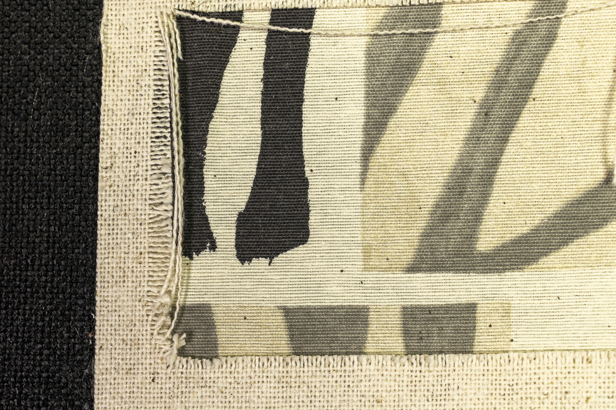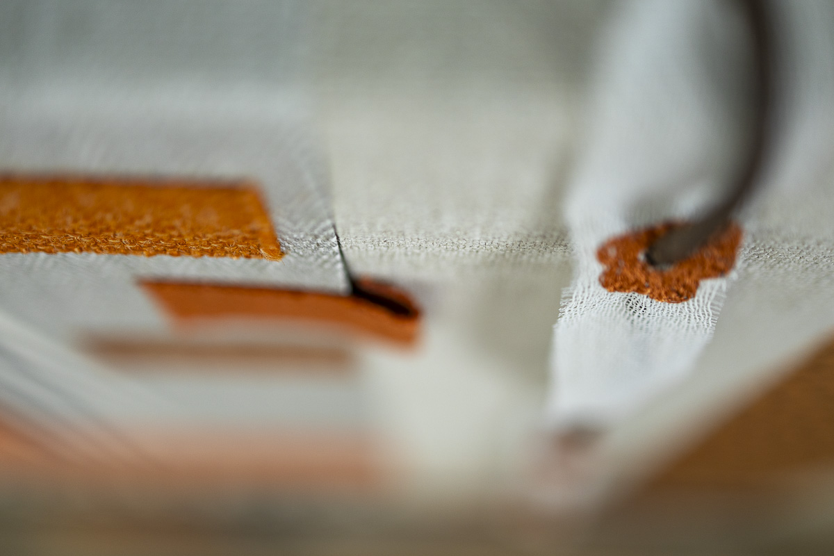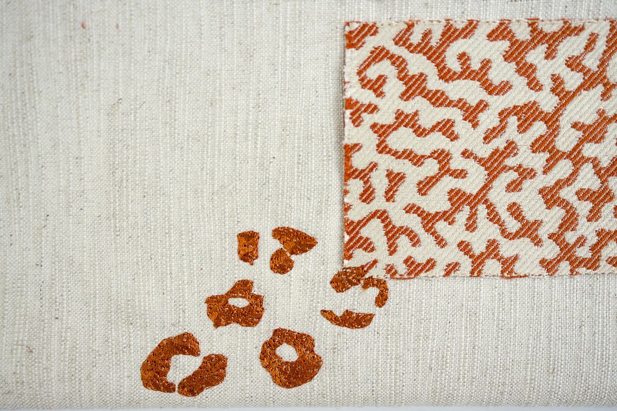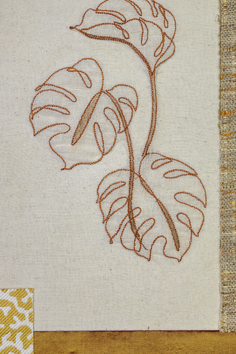 The embroidered plants are not just decorative details. They are a part of the structural pattern that connects the four works within Tropic Grid.
