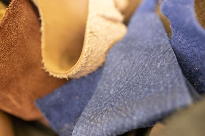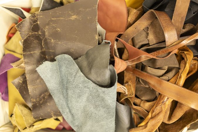 De pixelstructuur is vervolgens teruggebracht in het fysieke object als een handgesneden rand, gemaakt van hergebruikte leren reststukken en nepleer uit staalboeken. Dit materiaalcontrast versterkt het borduurwerk in het midden en zorgt voor een heldere omlijsting die het werk weer passend maakt binnen een hedendaagse interieurcontext.